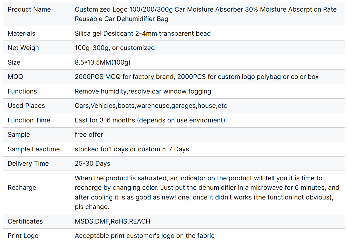 A: We offer moisture solutions for cargo shipping and storange,our main products include:Container desiccants,Silica gel packets,Clay desiccant bags,Cacl2 desiccant sachets,
